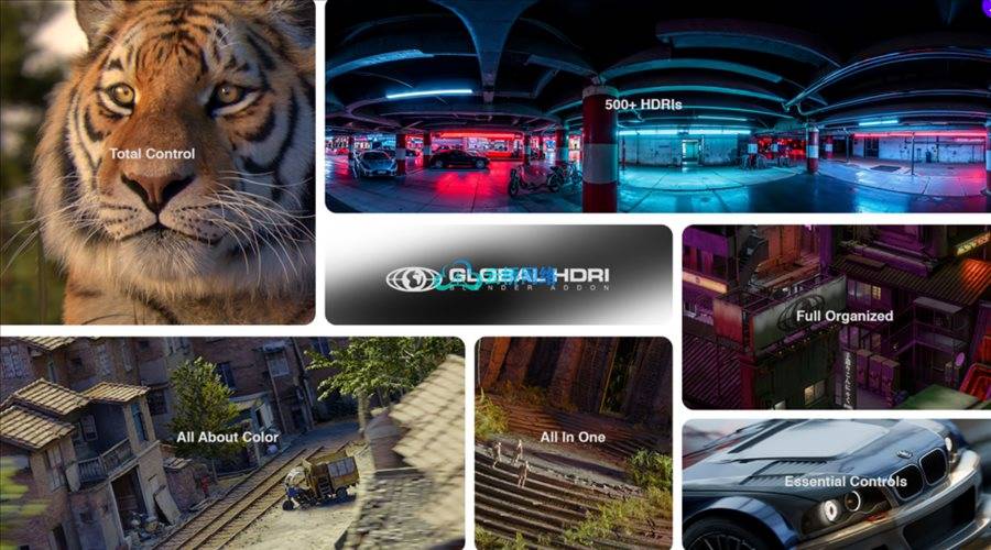Global HDRI 集成了超过500种高质量的HDRI环境贴图,涵盖从自然光到人工光源的多种场景。所有贴图均以8K分辨率呈现,确保渲染效果的极致细腻。