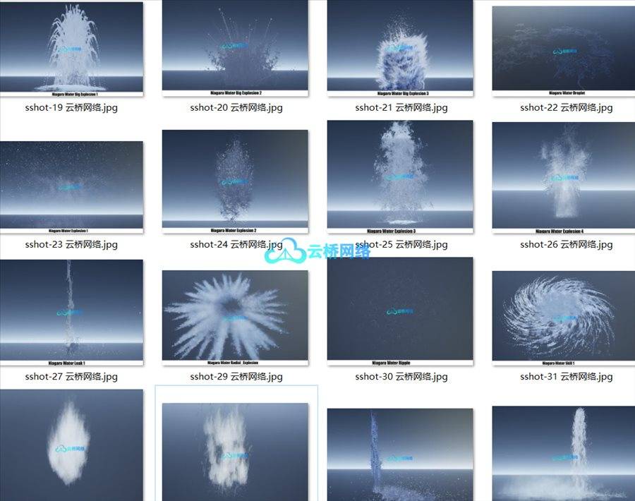 该特效包包含18种高质量水特效,涵盖了多种水体动态表现,如爆炸、瀑布、泄漏、喷溅等。以下是其主要内容: