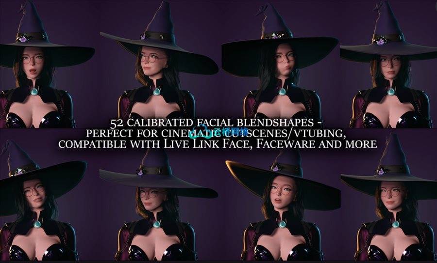- 包含 52个校准的面部混合形状,适用于电影级过场动画,兼容 Live Link Face、Faceware 等面部捕捉工具。