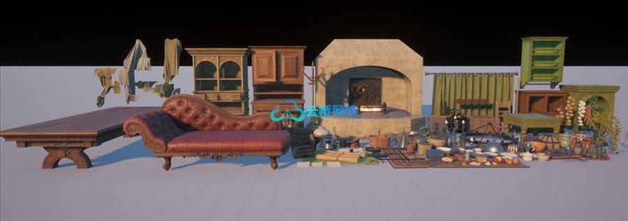 《幻想室内环境》的核心优势在于其多样化的资产库。这些资产不仅数量庞大(182个独立网格),而且每一件都经过精心设计,具有独特的艺术概念。从书架、灯具到装饰品和家具,每一件资产都展现了高水平的细节和艺术性。这些资产不仅适用于幻想风格的图书馆场景,还可以灵活组合,用于其他类型的幻想环境。