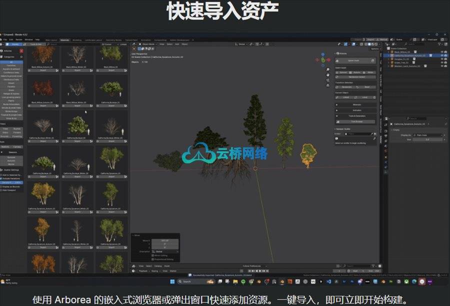 Arborea的设计始终以用户体验为核心。其自定义饼菜单和快捷键功能让用户能够快速访问核心功能,如资产浏览器、季节切换和工具集,而不会打断创作流程。