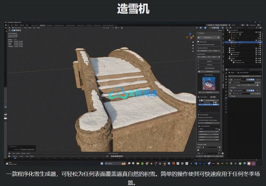 这个程序化工具可以轻松为任何表面覆盖上逼真的雪效果,简单的控制选项使其适用于任何冬季场景。 - 手绘藤蔓工具
