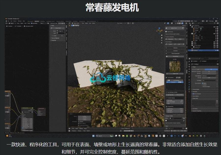 - 常春藤生成器:用于在表面、墙壁或地形上快速生成逼真的常春藤,用户可以完全控制密度、分布和随机性,非常适合添加自然的过度生长细节。