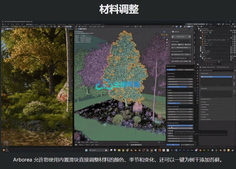 Arborea提供了灵活的材质调整功能,用户可以通过内置滑块直接修改颜色、季节和变体。例如,只需点击一下,就能为树干添加苔藓效果。