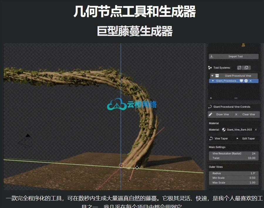 - 巨型藤蔓生成器:这是一个完全程序化的工具,可以在几秒钟内生成自然逼真的巨型藤蔓。其灵活性和速度使其成为许多项目的首选工具。