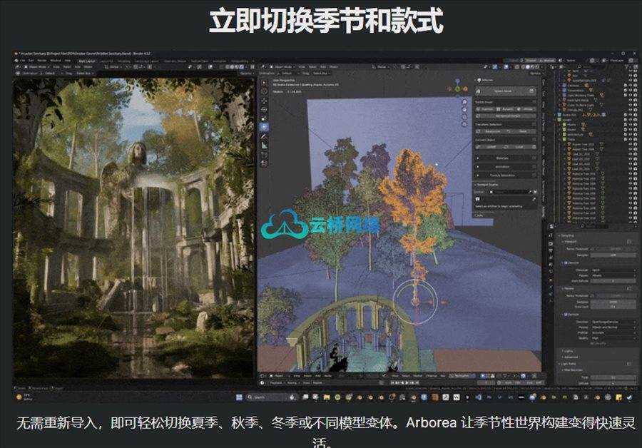 此外,季节切换功能让用户能够快速在夏季、秋季、冬季或其他变体之间切换,无需重新导入模型。这一功能为季节性场景的构建提供了极大的便利。