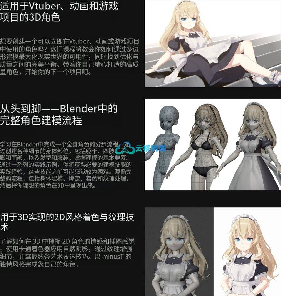 - 2D风格的着色和纹理技巧在3D中的应用 学习如何将2D角色的情感和插画风格融入3D建模。运用卡通着色器实现自然的阴影效果,通过纹理增强细节,并掌握线条艺术的表现技巧。用minusT独特的风格完成你自己的角色。