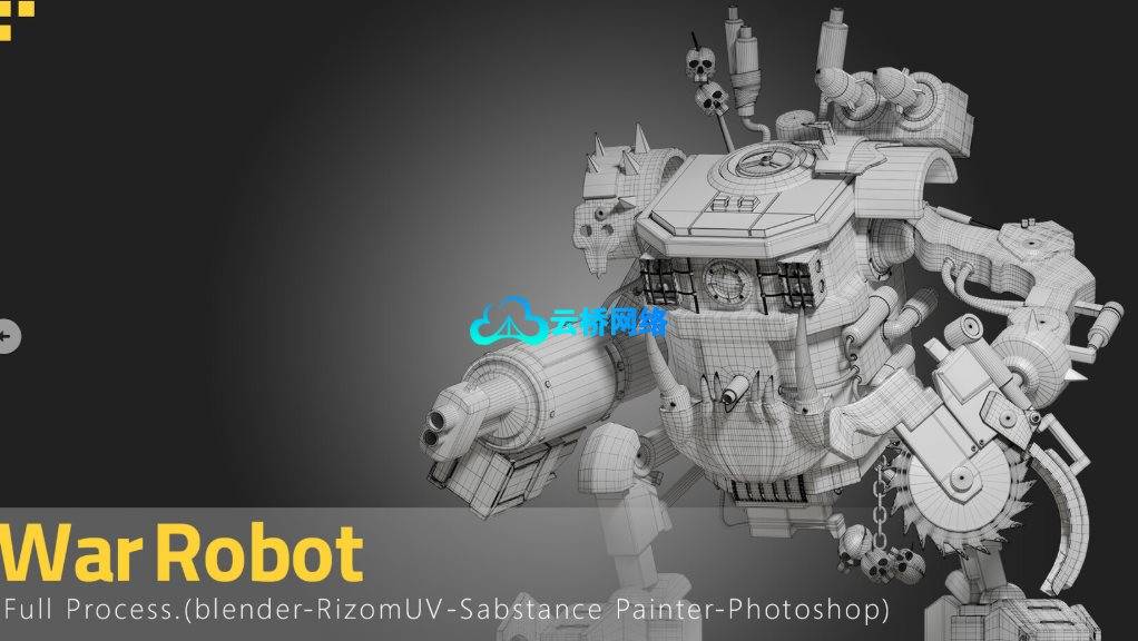本套教程为一部时长约20小时的无旁白完整视频,演示如何从零开始制作一款战斗机器人(War Robot)的全流程。教程面向已经具备基础软件操作能力的用户,所涉及的软件包括 Blender(建模与渲染)、Rizom UV / unfold3d(UV 展开)、Substance 3D Painter(贴图)、以及 Photoshop 与 Nik Collection(后期处理)。教程分为四个主要部分:建模、展开、贴图与渲染/后期,每一部分均着重展示实操细节与专业工作流程。