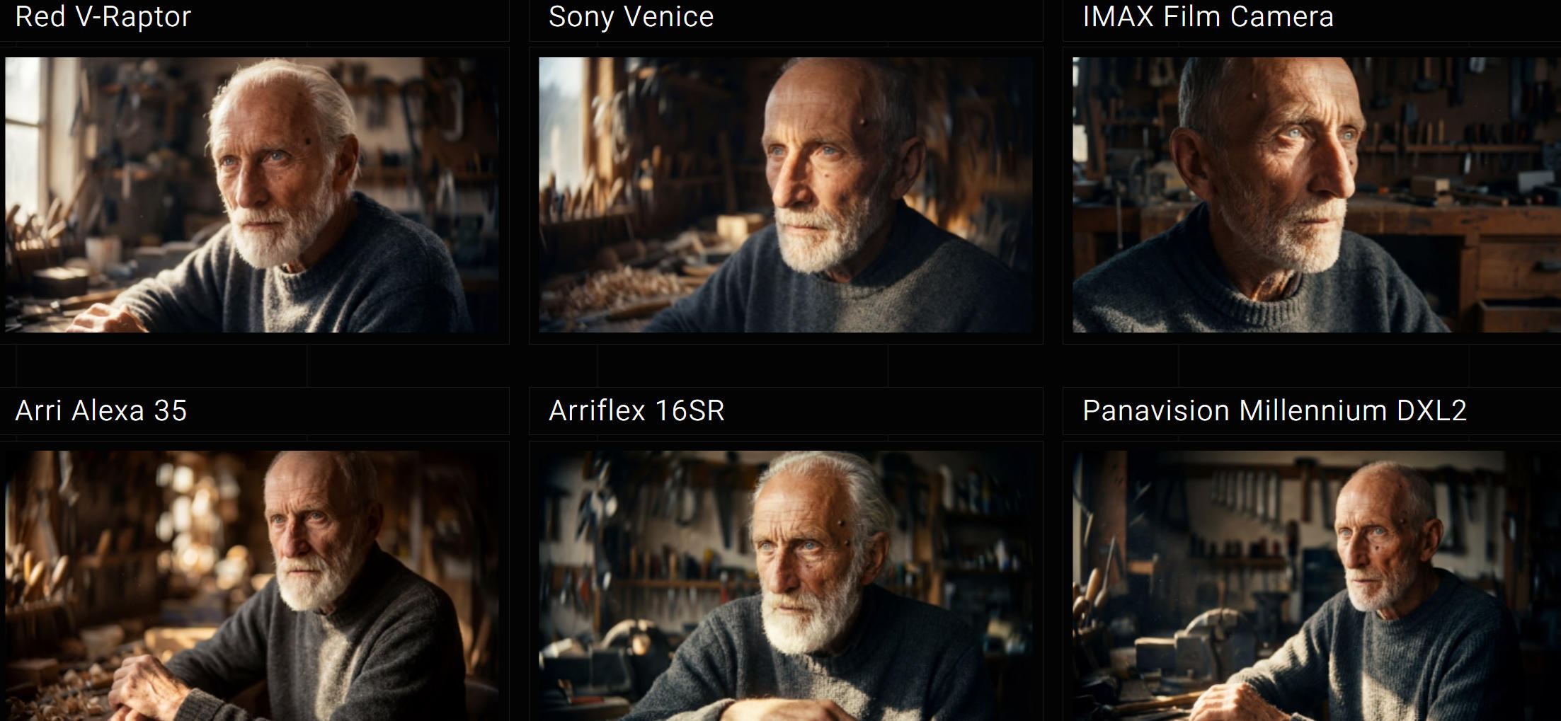 翻译参考:这是一幅电影特写般的肖像:一位面容清瘦的80岁长者,长形方脸,颧骨高耸锐利。他有一双深陷而锐利的冰蓝色眼睛,眼角布满深深的鱼尾纹,鼻梁高挺呈鹰钩状,略带弯曲。皮肤是深沉的古铜色,质感如皮革,右额有一枚明显的小痣。他蓄着浓密粗硬的白色短须,发际线后退,稀薄的白发向后梳拢。身着炭灰色粗针织羊毛衫。他正在一间光线昏暗的工作室内劳作。一束温暖的阳光恰好照亮他的脸庞与双手,细微的毛孔与空气中的尘埃在光中清晰可辨。背景可见工作室的工具。画面质感极度细腻,色调自然,拥有高动态范围。