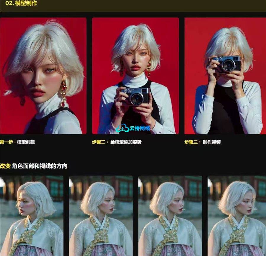 模型与视频创作:从模型创建、姿势设计到生成广告视频和高分辨率动画片段。